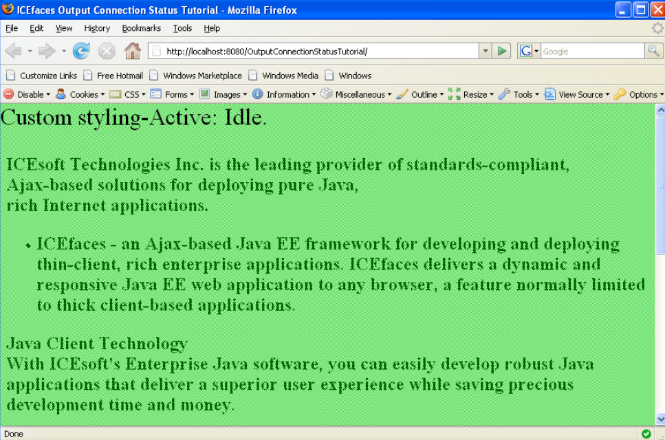 The outputConnectionStatus component provides an ideal mechanism to provide continuous real-time feedback to users of the status of their ICEfaces application. It is particularly important to inform users when the application is busy sending and receiving data in response to a user-initiated action to manage their expectations with respect to application readiness for additional user input. Generally, the outputConnectionStatus component should be located in a consistent location throughout an ICEfaces application.
