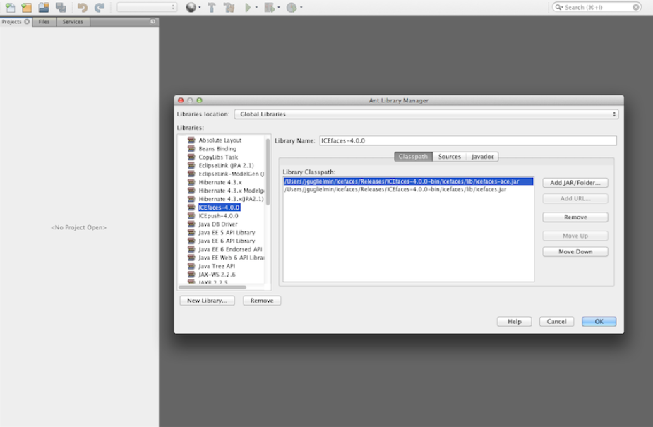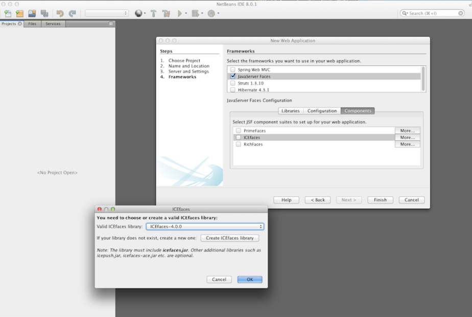 Check the release notes of the particular ICEfaces bundle you have downloaded to determine which versions are supported. Reviewing ICEfaces-4.0.0-RC1 release notes indicates Mojarra 2.2.7 is supported, so that would be the version we will include in this project. This matches what NetBeans 8 is considering the jsf 2.2 library, but if you are updating libraries, you may need to create an additional JSF library.