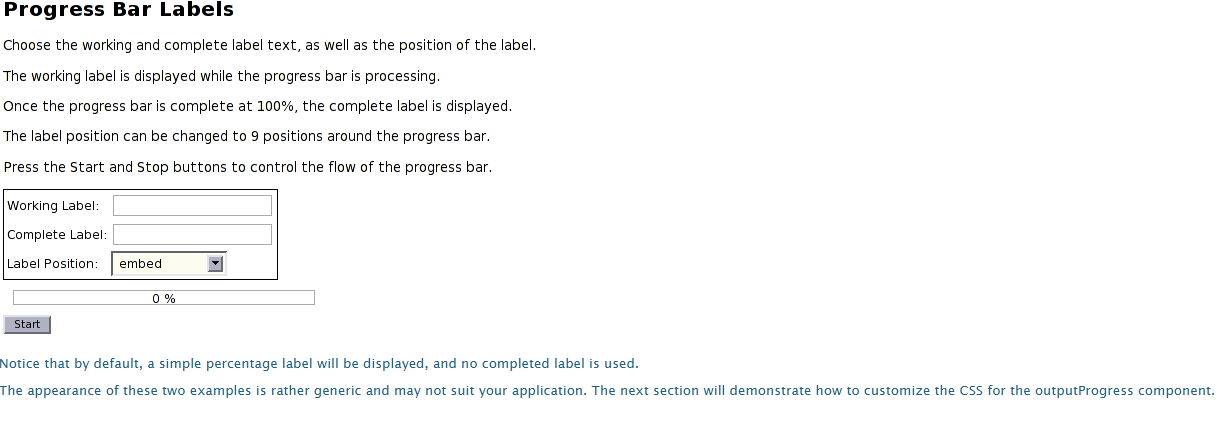 The appearance of these two examples is rather generic and may not suit your application. The next section will demonstrate how to customize the CSS for the outputProgress component.