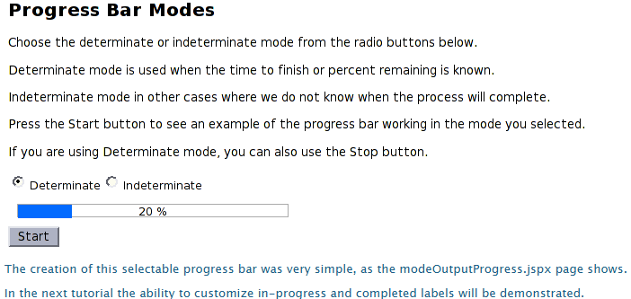 The progress bar requires the management of the completed percentage at a backing bean level. How the percentage is updated depends on the developer's application. In some cases it is inside a separate thread, in others it is set from a loop in the business logic. In the case of this tutorial, each demo will use a threaded backing bean to track the percentage and any other attributes of the progress bar.