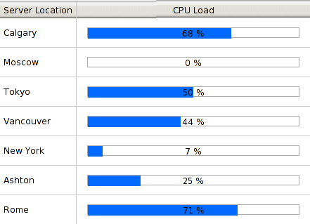 As you can see, this is a fairly standard dataTable with two columns. By constantly updating the percentage values of the simulated CPU load, we can demonstrate how a server monitoring suite could implement multiple progress bars. The finished result is similar to the following: