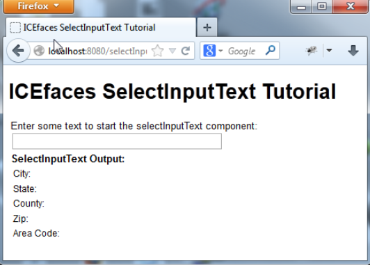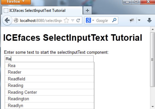 Nested in the ice:selectInputText component tag is an f:selectItems JSF tag. The 'value' binding in this tag provides the list of available options. The screen shot below shows the component in action: